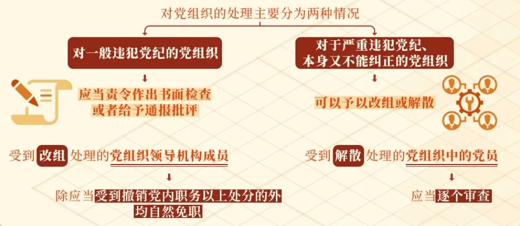 根據(jù)《中國共產(chǎn)黨紀(jì)律處分條例》規(guī)定,對(duì)黨組織的處理主要分為兩種情況:對(duì)一般違犯黨紀(jì)的黨組織,上級(jí)黨組織應(yīng)當(dāng)責(zé)令其作出書面檢查或者給予通報(bào)批評(píng);對(duì)于嚴(yán)重違犯黨紀(jì)、本身又不能糾正的黨組織,上一級(jí)黨的委員會(huì)在查明核實(shí)后,根據(jù)情節(jié)的嚴(yán)重程度,可以予以改組或解散。