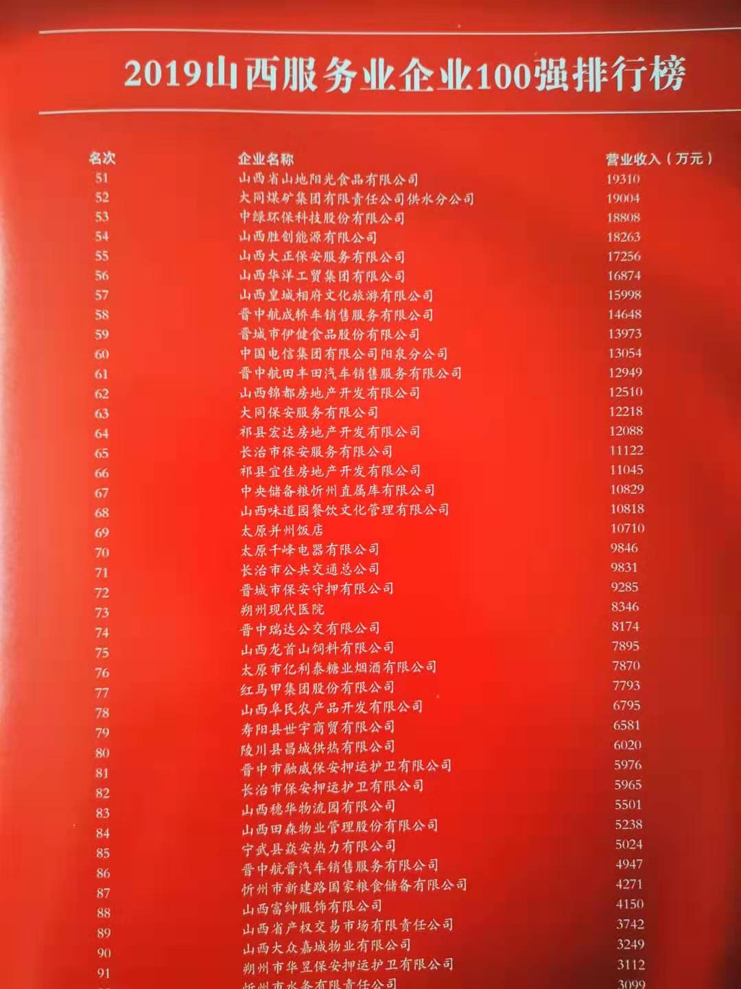 11月8日,2019山西企業(yè)100強在省城太原發(fā)布。經山西省百強企業(yè)排序專家委員會審定,山西大正保安服務有限公司再次榮獲“山西省服務業(yè)100強企業(yè)”,這是該公司自2014年以來連續(xù)五次榮登該榜。公司黨委副書記、副總經理陳志平前往參會。