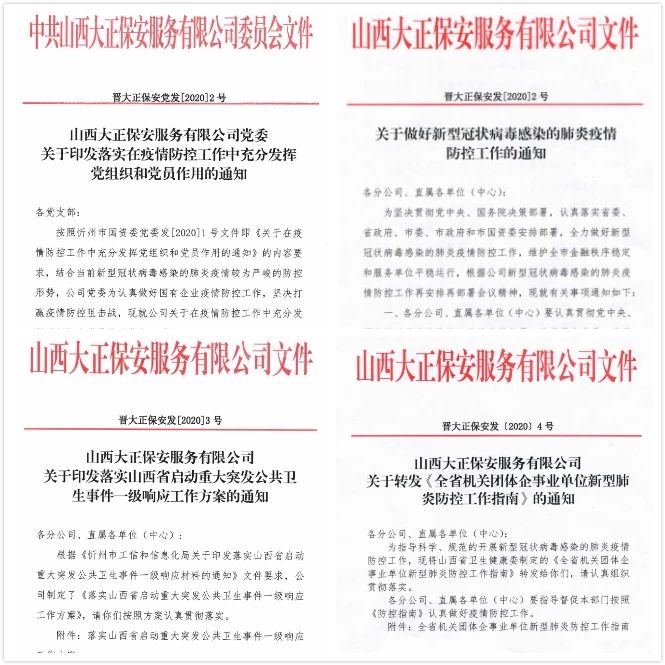 為深入貫徹習(xí)近平總書記對新型冠狀病毒感染肺炎疫情防控工作的重要指示精神,堅(jiān)決落實(shí)黨中央重大決策部署及省委、市委、市國資委部署安排,山西大正保安服務(wù)(集團(tuán))有限公司印發(fā)《關(guān)于做好新型冠狀病毒感染的肺炎疫情防控工作的通知》、《山西大正保安服務(wù)有限公司關(guān)于印發(fā)落實(shí)山西省啟動(dòng)重大突發(fā)公共衛(wèi)生事件一級響應(yīng)工作方案的通知》,要求公司各部門把防控疫情作為當(dāng)前最重要的工作來抓,落實(shí)落細(xì)防控措施,切實(shí)保障員工安全,保障全市金融秩序穩(wěn)定和服務(wù)單位平穩(wěn)運(yùn)行。集團(tuán)公司黨委印發(fā)了落實(shí)在疫情防控工作中充分發(fā)揮黨組織和黨員作用的通知,要求基層黨支部、全體黨員深刻認(rèn)識疫情防控形勢,全面落實(shí)我市“五嚴(yán)五防”措施,用實(shí)際行動(dòng)踐行初心使命。