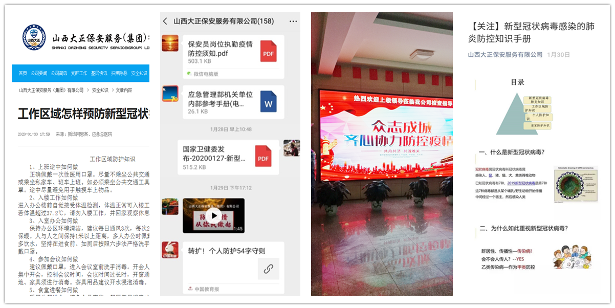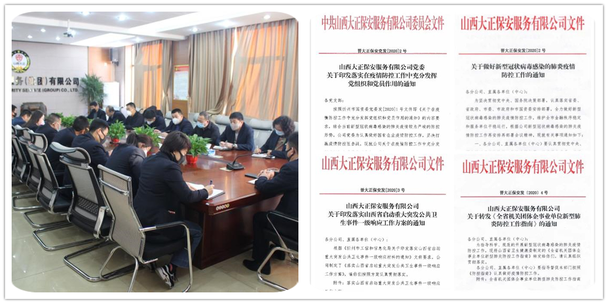 新型冠狀病毒肺炎疫情爆發(fā)以來,山西大正保安服務(wù)有限公司堅(jiān)決貫徹黨中央、國(guó)務(wù)院決策部署,深入貫徹省委、省政府,市委、市政府和市國(guó)資委安排部署,認(rèn)真落實(shí)“堅(jiān)定信心、同舟共濟(jì)、科學(xué)防治、精準(zhǔn)施策”的總要求,根據(jù)企業(yè)實(shí)際情況周密安排部署,多措并舉扎實(shí)推進(jìn)企業(yè)疫情防控工作。