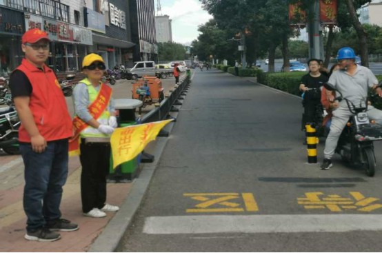 紅燈亮起,停車線邊的工作人員便舉起手中的小旗,向行人與車輛作出停止示意,并對停車位置有誤的電動車做出指揮和引導,對搶行、闖紅燈等不遵守交規(guī)的行人進行制止;對年紀較大、腿腳不便的居民,志愿者主動攙扶,護送其安全的過馬路。在志愿者的文明勸導下,行人闖紅燈現(xiàn)象明顯減少,車輛和行人安全有序通行,道路交通安全暢通。