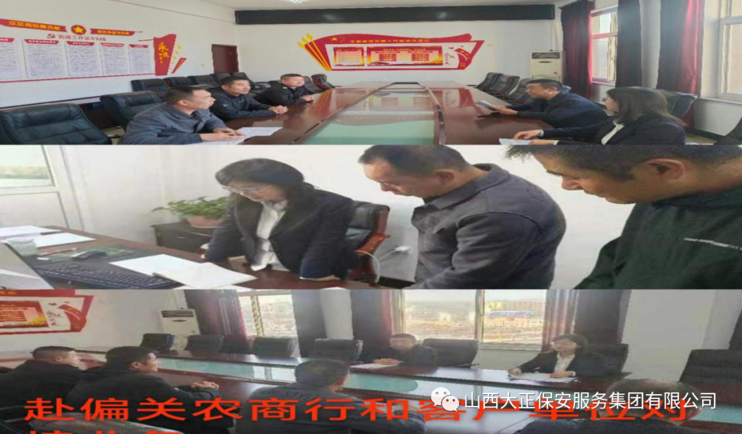 人防公司副經(jīng)理牛文亮和樊杰前往偏關(guān)縣農(nóng)商行與客戶單位走訪,巡查了解員工執(zhí)勤情況,安排布置執(zhí)勤要求,并和個別員工談心交流。檢查執(zhí)勤站點周邊衛(wèi)生,營造良好的執(zhí)勤氛圍,就近期保安工作進行溝通,客戶對本公司的安保工作給予了高度認可。
