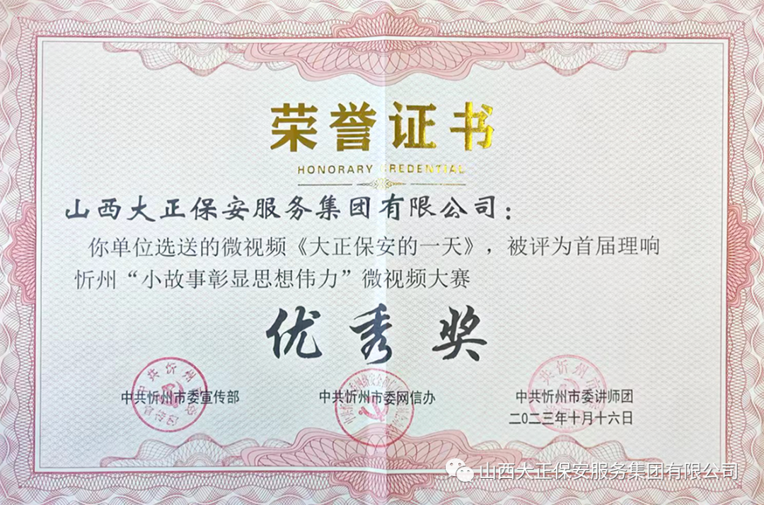 中共忻州市委宣傳部、中共忻州市委網(wǎng)信辦、中共忻州市委講師團(tuán)聯(lián)合舉辦的首屆理響“小故事彰顯思想偉力”評(píng)選結(jié)果日前公布,我公司選送的作品《大正保安的一天》獲優(yōu)秀獎(jiǎng)。