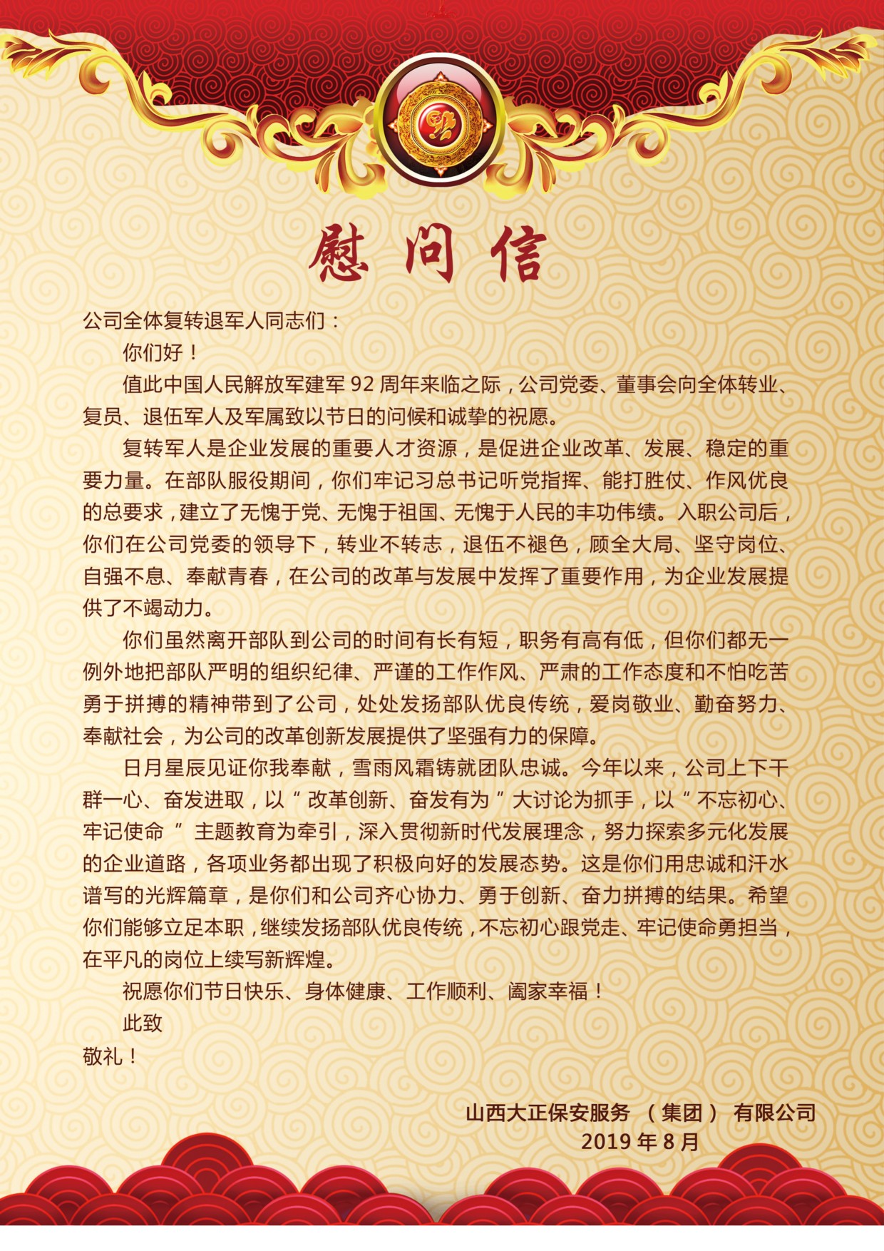 黨委委員、副總經(jīng)理趙培宏宣讀《慰問(wèn)信》,信中談到:公司的每位復(fù)轉(zhuǎn)軍人都是企業(yè)發(fā)展的重要人才資源,是促進(jìn)企業(yè)改革、發(fā)展、穩(wěn)定的重要力量,處處發(fā)揚(yáng)著部隊(duì)優(yōu)良傳統(tǒng),為公司的改革創(chuàng)新發(fā)展提供了堅(jiān)強(qiáng)有力的保障。希望大家能夠以“改革創(chuàng)新、奮發(fā)有為”大討論為抓手,以“不忘初心、牢記使命”主題教育為牽引,立足本職,發(fā)揚(yáng)部隊(duì)優(yōu)良傳統(tǒng),不忘初心跟黨走、牢記使命勇?lián)?dāng),在平凡的崗位上續(xù)寫(xiě)新輝煌。