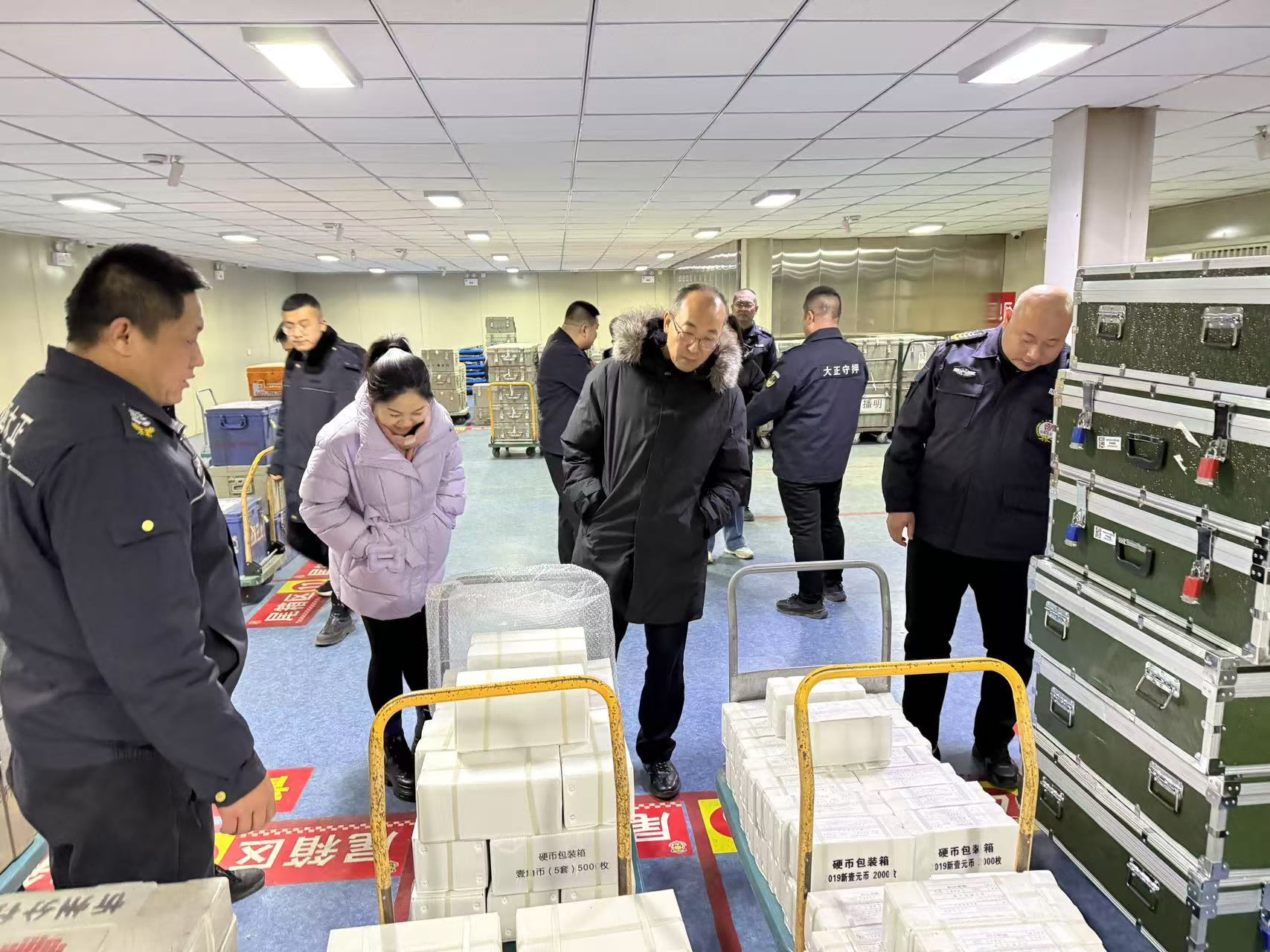 在守押公司監(jiān)控中心,副經(jīng)理吳杰與隨行人員通過(guò)遠(yuǎn)程監(jiān)控畫面觀看金庫(kù)清點(diǎn)查驗(yàn)款箱(包)視頻影像,通過(guò)視頻對(duì)講聽取各大隊(duì)查庫(kù)負(fù)責(zé)人情況匯報(bào),完整準(zhǔn)確全面掌握查庫(kù)工作的進(jìn)展情況。對(duì)守押各大隊(duì)和基層中隊(duì)的年終查庫(kù)工作給予充分肯定,全體員工忠于職守,認(rèn)真履職,各負(fù)其責(zé),密切配合,體現(xiàn)了守押隊(duì)員的責(zé)任感和使命擔(dān)當(dāng),圓滿完成跨年查庫(kù)工作,為2024年守押工作圓滿畫上句號(hào),為2025年安全運(yùn)行奠定堅(jiān)實(shí)基礎(chǔ) 。