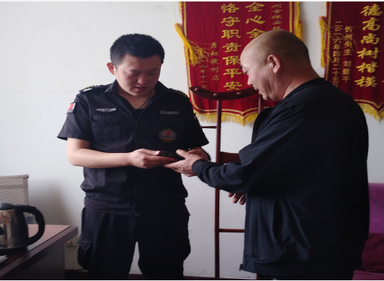 5月9日,山西大正億通保安安全技術(shù)公司巡邏隊隊員楊鑫磊、姜濤在開展日常巡邏工作中,在某銀行發(fā)現(xiàn)一個黑色駕駛證本,里面裝有現(xiàn)金、證件及銀行卡。
